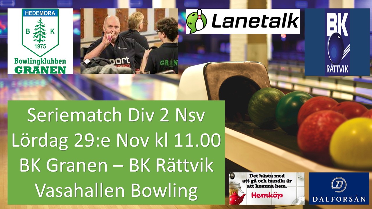 På Lördag gästas BK Granen av serieledande BK Rättvik i Vasahallen Bowling. Efter en veckas nedstängning av bowlinghallen så har föreningen återigen fått träna i hemma-hallen, då kultur- & fritidsutskottet i Hedemora Kommun på Måndagen beslutat att organiserad förenings-verksamhet får återupptas.